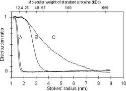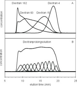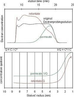 Die durch Permeation / Diffusion modifizierte Probelösung und die originale Probelösung werden auf einer kalibrierten SEC-Säule chromatographiert und Änderungen in der Größenverteilung des Retentats oder Permeats damit analysiert. Die Größendispersionen beider Proben werden verglichen und der Quotient q = C/C* für jede Elutionszeit bzw. Stokes 'Radius berechnet. Das resultierende Diagramm des Konzentrationsquotienten ist geeignet zur Beschreibung der Membrantrenngrenze und der Porengrößenverteilung.